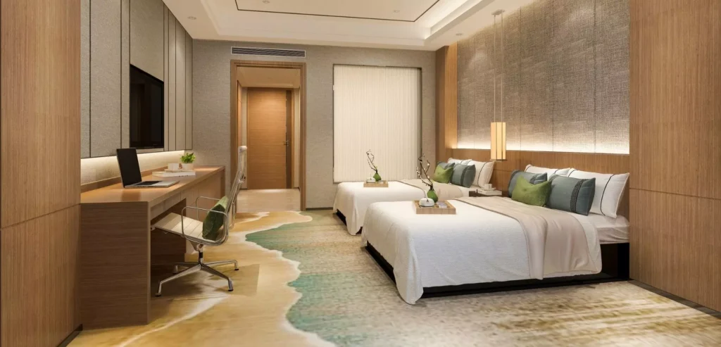 Our thoughtfully designed rooms provide peaceful ambiance, soft lighting, premium furnishings, soundproof comfort, private bathrooms, luxury toiletries, fresh linens, and calming décor creating a perfect retreat after long journeys daily.